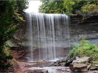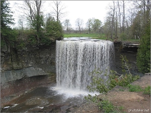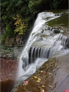 Almost inside a city, Indian Falls are in Sarawak Township, at the northwestern edge of Owen Sound. A one-kilometre walk through Indian Falls Conservation Area leads through ferns, trees and wildflowers. The horseshoe-shaped falls drop to a quiet pool before Indian Creek flows on to empty into Owen Sound Bay.