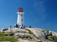 Peggy’s Cove原本是一个安静的小渔村。由于其特有的海岸景致,巨石,海浪和灯塔使她声名远播。如今这里不但是加拿大的标志之一,还被摄影家誉为最上镜的地方。这里的渔村依旧保持着原始质朴的风貌,色彩斑驳的木屋,设备简陋的渔船,略显凌乱的码头,处处流露出曾经沧海桑田的悠远,在碧海蓝天的映衬下的确耐人寻味。只不过与四周的各式新款轿车实在有些格格不入。不远处的岸边,