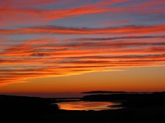 7号路到Sherbrooke以后便转向内陆,离开了美丽的东海岸。两个小时之后的黄昏时分,我们通过Canso Causeway终于踏上充满神奇的Cape Breton。我们继续沿19号公路向今晚的宿营地Mabou进发。一路上开始缓缓的上坡,大海很快又出现在我们眼前。夕阳西下,远山近水在金色的阳光下显得温暖妩媚。山坡上色彩艳丽的农庄,造型优美的教堂,在夕阳的照耀下更加的光彩夺目。太阳已缓缓的坠向海平面,金灿灿的光芒洒满波光粼粼的海面,给雪白的云朵镶嵌上金边。原本亮丽的天空逐渐暗淡下来,远处的山峦,近处的山庄渐渐只剩下清晰的剪影。太阳越沉越低,晚霞由远及近的映红了整个天空,由淡淡的水红变成眩目的金红,等太阳完全消失在海面以下,那漫天的彤云变幻着更加无比绚丽的色彩,美得令人心悸。晚风中我们相依着站在上坡上,直到最后一线光芒消失在天际。 我们披星戴月,终于在晚上八点半