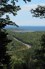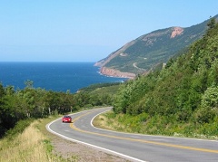 Breton National Park,在门口买了门票,拿了地图,又咨询了一下营地的情况后便沿着Cabot Trail继续北上。一进入公园的大门,眼前的景观霍然开朗,山的雄伟,海的辽阔就这样一览无余的展现在眼前。很快我们到了第一个观景台,放眼望去是山海相接的壮观奇景。这是一幅在无数明信片和画册中出现的画面,如今身临其境,仍然有一种震撼的感觉。群山巍峨高耸,海面浩瀚宽广,山海相接之处悬崖耸立,Cabot