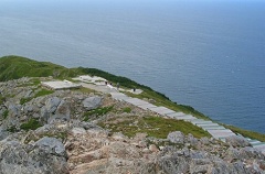 Breton有许多的观景台,我们几乎每到一处都要停下来观赏一番,赞叹一番。 正午12:00我们来到著名的Skyline Trail。开始的一段穿行在浓密的树林中,随后是低矮的灌木丛。一簇簇金黄色的野花点缀其中,在阳光下摇曳多姿。太阳终于挣脱了云层的束缚,露出灿烂的笑脸。天空由灰暗变成浅蓝,又渐渐变成明丽的湛蓝。原本成片的阴云逐渐消散,变成朵朵白云漂浮在天际。Trail的尽头是位于山巅的平台,站在这里,迎着呼啸的海风极目远眺,尽收眼底的是海天一色的湛蓝,天上有白云朵朵,海面上有浪花点点。两边是巍峨的群山,陡峭的悬崖,还有郁郁葱葱的河谷。盘山公路蜿蜒曲折,想想我们就是沿着它一路走来,还真有一种惊心动魄的感觉。这里不仅有壮美的景色,还有珍稀独特的植被。在强劲的海风中,山坡上不用说没有树木,连矮小的灌木也难以存活,只有类似地衣苔藓类的植物顽强的扎根在岩石的缝隙,在怪石嶙峋中仿佛沙漠里的片片绿洲。我们沿着木版铺就的小路顺山坡而下。狂风吹的人东倒西歪,停下来拍照都觉得站立不稳。路边的石缝中,居然有簇簇小雏菊迎着狂风傲然怒放,在蓝天碧海的映衬下是无以言表的亮丽,不由得令人感叹生命的顽强与美丽。我们流连在山海奇景中,那份壮阔与宽广带来的震撼实在是语言难以描述的。