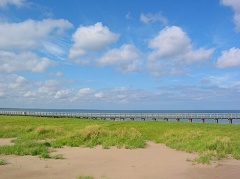 Irving Eco-Centre。途径号称龙虾之都的Shediac,瞻仰了一下那只世界上最大的龙虾(雕像),的确做的是栩栩如生。The Irving Eco-Centre的著名之处是海边的沙丘地貌,及具考察和研究价值,夏天旺季时还要限制参观人数。要论沙丘的壮观以及四周景色之美,这里与PEI相差太远了。而我之所以执意要来这里,是对她那海边绵延数公里的木制长桥情有独钟。此时天已渐渐放晴,天空虽然不是那么明丽透彻,但倚栏远眺已是久违的蔚蓝。就这样徜徉在弯弯曲曲的木桥上,凭海临风也是一种享受。