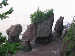 Hopewell Rocks。由于我的错误指挥,我们在Moncton堵车耽误了近半个小时,赶到Hopewell Cape时公园刚刚关门,我们只好沿侧面小路徒步到海边。正是退潮时节,空旷的海滩上乱石嶙峋,不远处矗立着几座石柱。这些岩柱早先也是岸边绝壁的一部分,是千百年来的潮汐冲刷才把它们一个个分割出来。这些石柱的行状无一例外都是上大下小,有些顶上还生长着丛丛树木,虽没有黄山梦笔生花的楚楚动人,倒也称得上造型独特了。走近那一座座小山一样的岩柱,才能真切的感受到它的高大。Fundy