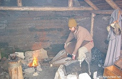 Brunswick附近去采办货物,主要是皮毛和木材,并在冬季到来之前返回欧洲。我们随着讲解员参观了整个遗址,Viking最大的贡献是从欧洲带来了炼铁技术,并且他们在这里修整时的主要任务就是炼铁做钉子来修补船只。生存在如此严酷的环境中,那种艰辛是我们难以想像的。整个公园中最吸引人的是遗址复原部分,几间按照原型复制的土坯茅草房,分别是居室,储藏室和工作间之类的地方。工作人员都穿着当年的服装,展示一千年前的人们是如何在这里生活的。他们用鱼骨作针,缝制各种兽皮作衣服和鞋子,用石头作纺锤来纺布,还有很奇特的用来炼铁的锅炉。说到炼铁,不能不提到这里的铁匠,一个憨厚朴实的小伙子。他干的活儿在这里算是最辛苦的,他卖力的煽风点火,敲敲打打,不一会儿就做出一个铁钉,其实不过是一截儿削尖的铁棍儿。他热情的向我们讲解整个炼铁打铁的过程,亲自操作时居然掏出一副安全眼镜带上,一本正经的说要注意安全,惹得周围的游客哄堂大笑。L’Anse