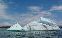 Cove,连来往的车辆都少了许多。海面上波澜不惊,却仿佛浪花点点,正在疑惑间,一块巨大的白色物体映入眼帘。“看,冰山!”GuanGuan冲我大叫着。那真的是一座冰山,还有海面上那似浪花般的点点白色都是融化的浮冰。虽然眼前的这座冰山其貌不扬,象一段断壁残垣,但对于我们来说,那庞大的体积已足以令人惊叹了。过了Eddies