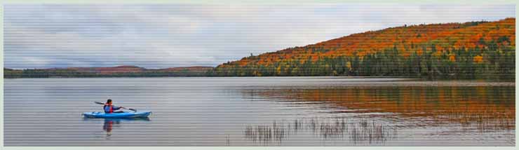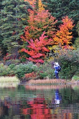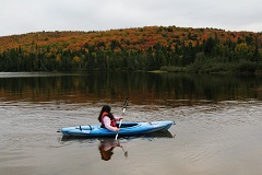 两个多小时之后大家终于尽兴而返,随后又去附近的Ragged Falls看了看便直奔Rock Lake营地。因为每个营地只能搭两个帐篷,因此今晚只能分男女宿舍了。GuanGuan和我的那个三人帐篷终于派上了用场, 买回来近7年后的今天终于在野外搭建了起来,不过那过程可真够复杂的,几个人七手八脚的摆弄了20分钟才终于搞定。刚收拾停当准备埋锅造饭,Paul同学却已经迫不及待的从车上卸下他的Kayak拖入水中,随后船桨一摆就消失在河湾中了,看得大伙这个眼馋。等他回来后大家开始轮番上阵,那单人的Kayak十分轻巧,在这种平水上行进并不需要多么高超的技艺,Paul在一边指点两下就可以出发了。轻舟荡漾在秋意阑珊的湖面上,山在水中,人在画境。