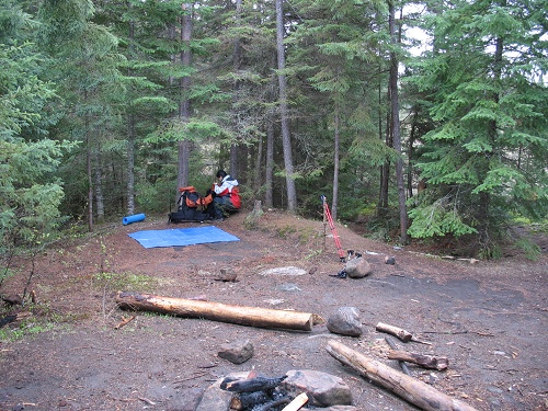 Lake的湖光山色尽收眼底。随后继续向前便来到Provoking Lake湖边,在路过的第一个营地驻扎着一大群人,湖边的空地上支着四个帐篷,八九个彪形大汉围坐在篝火边吃吃喝喝。好羡慕那温暖的营火和那舒适的帐篷,而我们前面还有7公里的艰辛路途。 Provoking