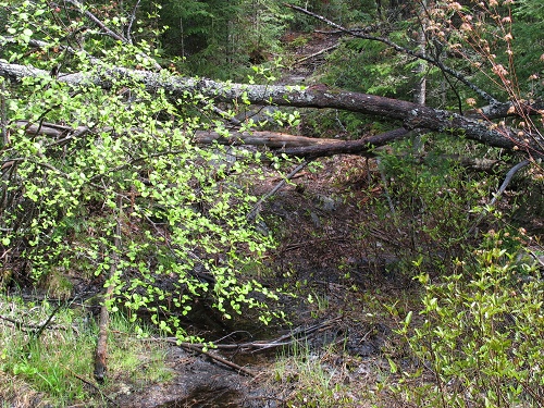 天气潮湿阴冷,乌云低沉。不知何时,冷风加杂着的细雨竟然变成了小冰粒,哗啦哗啦的倾泻而下,又急又密。天气已是如此恶劣,而路况并没有丝毫的改善,反而越来越难走。小路两边丛林茂密,高低粗细,各种各样被折断压倒的树木比比皆是。为了应付这些横七竖八的障碍物,我们有时绕道,无路可绕时只能攀爬一番甚至要俯身钻过去,给整个行程又平添了几分艰辛。从Mosquito