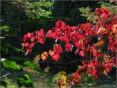 Lake波澜不惊,象是一条清静的小河,偶儿水面开阔,却又是一番天高云淡的宽广。小路的旁边古松参天,偶尔会有一团火红的枫叶在林间喷薄而出,全然是一份秋的绚丽。阳光明媚,天高气爽,实在是个野营的好日子。