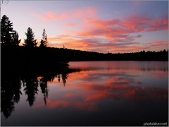 Lake,湖边共有三个营地可我们好象只看见了两个。随后的一段几乎是在密林中穿行,走了好久才终于见到那水草遍布的Ishkuday Lake。湖中野鸭游弋,在夕阳下很是一派祥和景象。风景虽好,可惜不适合居住。 傍晚6:30,经过9个半小时的艰苦跋涉GuanGuan和我终于回到了在湖边临时的家。趁着夕阳温暖,我们换上泳衣去湖里畅游了一番。在阳光下曝晒了一天的湖水温暖舒适,泡在其中实在是辛劳之后最美妙的享受。梳洗完毕,吃完晚饭,刚把篝火点起来就发现远处已是晚霞初现,缤纷的云朵被霞光染成绚丽的红,在天上水中相映如画。喜欢那云霞变幻中的灿烂,更喜欢与GuanGuan并肩看晚霞时的心心相印。