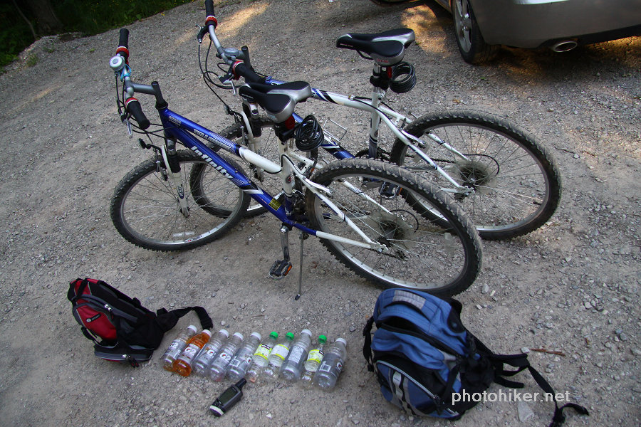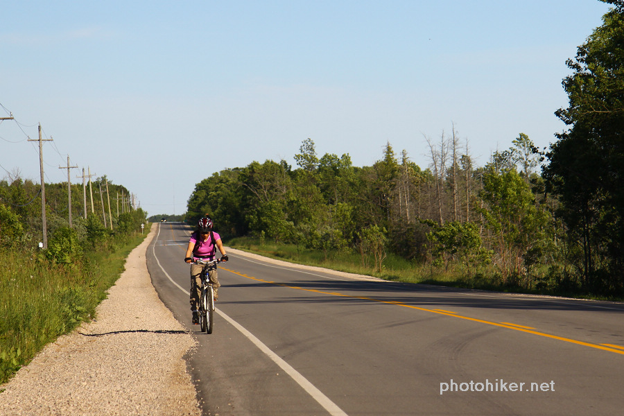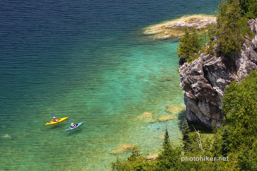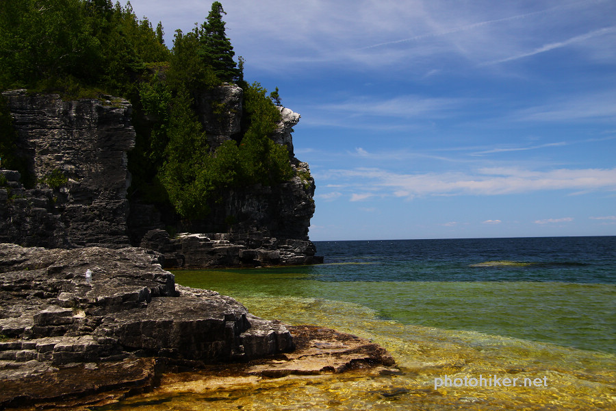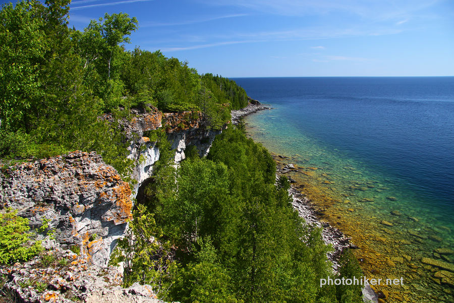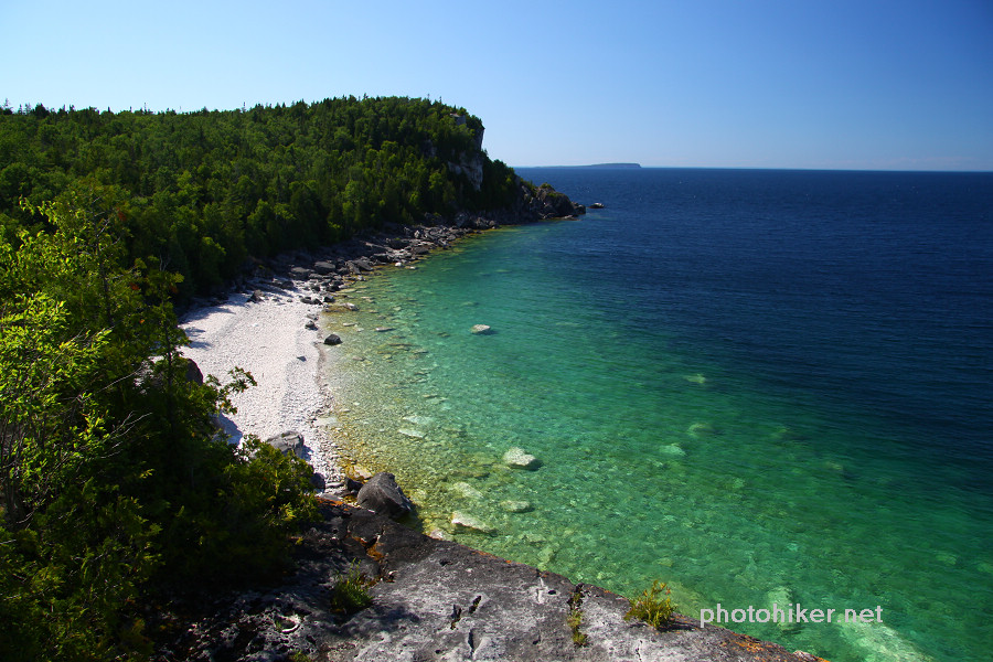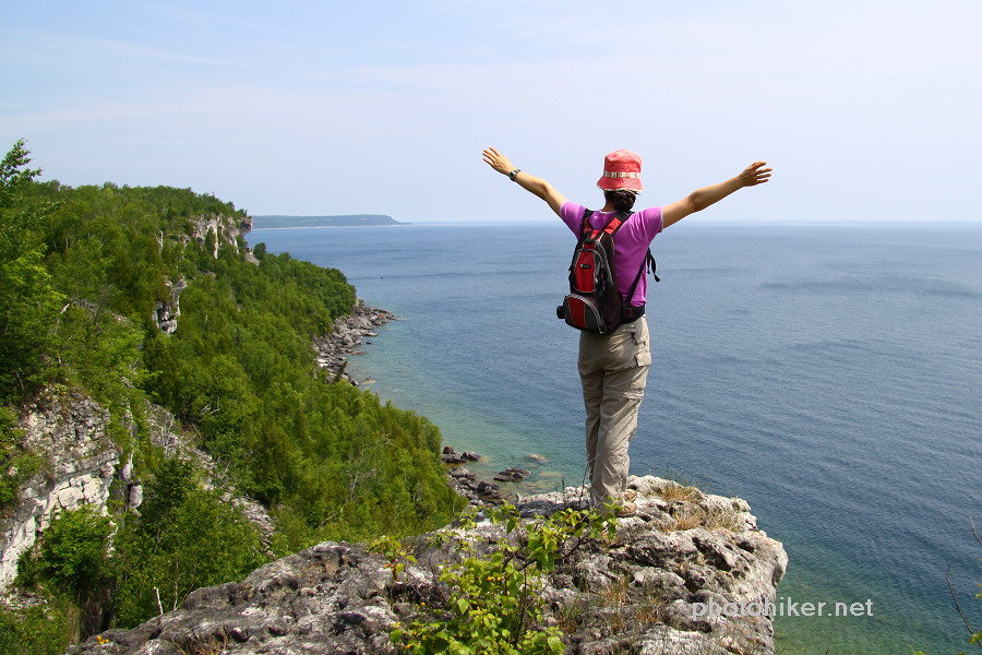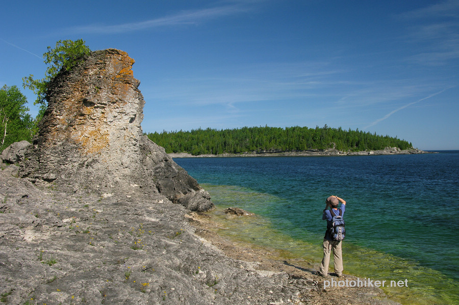 周日早早起床,外面阳光明媚,晨风清凉,我们终于可以去走Bruce Trail中最美的部分了。翻开厚厚的The Bruce Trail Reference Book,最后两页Trail的那条红线就游走在Bruce Peninsula National Park的岸边,这是最崎岖难走,同时又是风景最漂亮的一段路。和一年前一样,我们一早将自行车放在了Halfway Dump Side Trail的起点,而后驱车来到Tobermory镇外的Little Cove。早晨9点整装踏上了20km的征程。