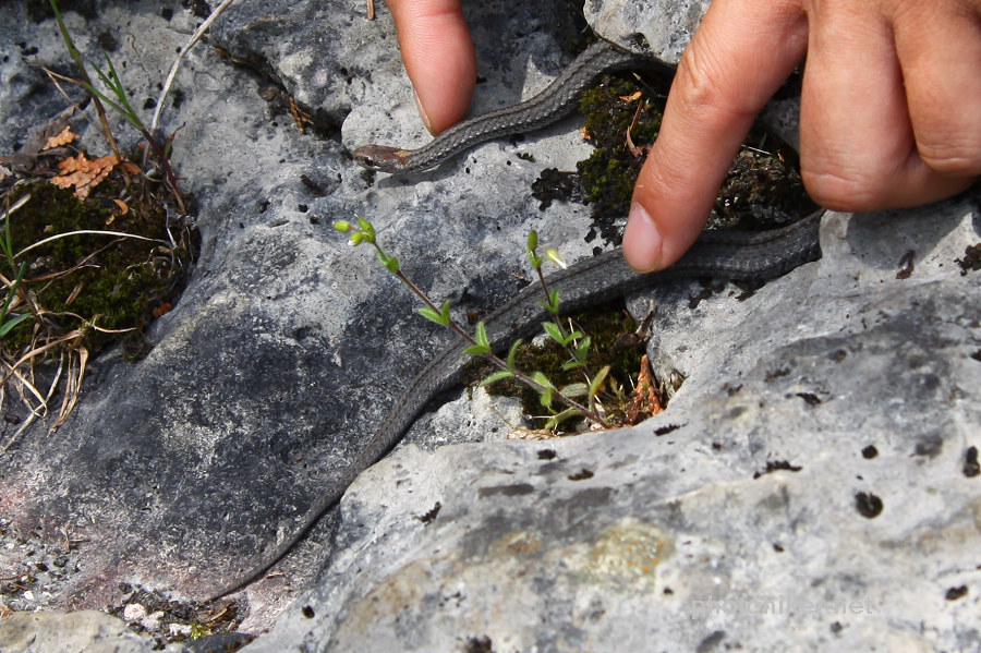 一条小蛇在石头上晒太阳,碰碰它居然没有反应。
