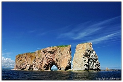 Rock身旁。倚着船舷,迎着呼啸的海风,面前的巨石又仿佛是一艘威武的军舰。被风吹散的白云丝丝缕缕的飘荡在空中,通体黄褐色的Perce Rock屹然矗立在天海之间,那风霜雕蚀过的石壁呈现出刀刻一般硬朗的线条,在天空的明净和大海的深邃中彰显着雄健的阳刚之气。你能真切的感受到那种朴实的,张扬的,令人敬畏的宏伟气魄。从船上终于能够清晰的看见那造型简约的拱门,还有巨石的尾部,因为风化塌陷而残留的一方小尖塔一样的断壁残垣。我们的小船绕着Perce