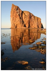 从Mont Sainte-Anne下来已是日落时分,我们直接来到巨石前方的浅滩。此时通向巨石脚下的小路仍旧淹没在潮水之下,夕阳用炫目的光芒将巨石映得通体金黄,巍峨的身姿倒映在水中,象极了一幅精美的油画。Perce