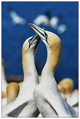 Gannet的介绍,总会发现其中必然有一幅这样的图画,两只鸟儿引颈昂头,两只修长的鸟嘴交错着指向天空,看上去那么虔诚圣洁。这是鸟儿夫妻小别重逢时相互致意的经典姿势。要说这些Gannet也真是神奇,他们可以在这样庞大的群体中准确的找到自己的伴侣。当一只鸟归巢之后,两只鸟一定会这样面对面的互碰鸟嘴已示亲密。当然也有少数认错对象的,往往一落地就被围攻,最后狼狈而逃。Northern