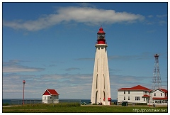 又是一个没有阳光的早晨。山谷中笼罩着更加厚重的阴云,昨天爬过的Mont Albert连半山腰都藏身云中了。我们别无选择,只能收拾东西继续上路。走出山地来到海边才发现天空早已云开雾散,真可谓“十里不同天”呀。我们沿Hwy132向西,一路上以大海为背景有着数不清的美景。其一就是灯塔,今天前后经过的三座灯塔中Matane Lighthouse姿态平平,忽略不计;Grand-Metis Lighthouse无人值守而且地处偏僻,但四周花繁草盛,景色宜人;最有特色的是Pointe-Au-Pere Lighthouse,塔高108尺,传统的红顶白墙,其特别之处在于支持塔身的八根侧臂,使整个灯塔完全摆脱了烟囱式的呆板造型,显得份外挺拔秀丽。