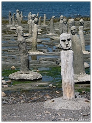 如果不是雷雨突至,我们还不知道要在公园里呆上多久呢。今天的路上还有一个地方值得一看,那就是Rimouski附近的Le Grand Rassemblement (The Great Gathering),俗称渔人雕像群。 雕像位于一家餐馆后面的海滩上,我们来回转了两趟才找到地方。这是雕塑家Marcel Gagon创作于1986年的杰作,近100个真人大小的木制或水泥的雕像井然有序的从河水中一直排到岸上。人群中有各色男男女女,老老少少,甚至还有孕妇,一个个满面风霜,步履沉重。远处还有几艘搁浅的破木船,上面的人更是衣衫褴褛,形同鬼影,总之整个画面和场景显得无比沧桑凝重。再加上雕像线条粗犷,作工简陋,更有一份原始质朴的感觉。艺术家将这组作品安放于河边实在是颇有想象力,随着St. Lawrence River潮汐的变化,在天气的阴晴雨雾,日出日落中,这些雕像仿佛被赋予了生命,他们时而被河水吞没,时而随红日破晓而出。正如同他们的先辈不畏艰辛的来到这片新大陆,用辛勤的劳动创造了幸福的家园。