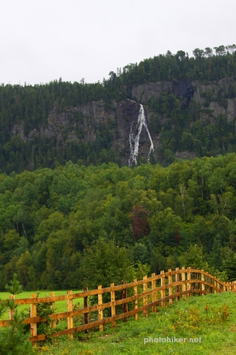 周日的下午我们在秋雨绵绵中先来到了南岸的L’Anse-Saint-Jean。从河边的悬崖上看去,峡湾中阴云低垂,一片雨雾迷蒙。山下还有个呈人字形的小瀑布,白练青山,秀美非常。只可惜因为正赶上狩猎季节,通往瀑布的小路关闭了,因此只能远远一观。
