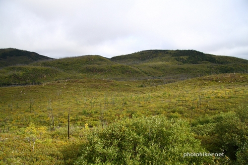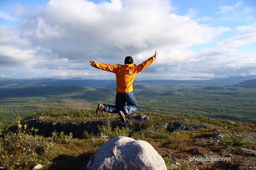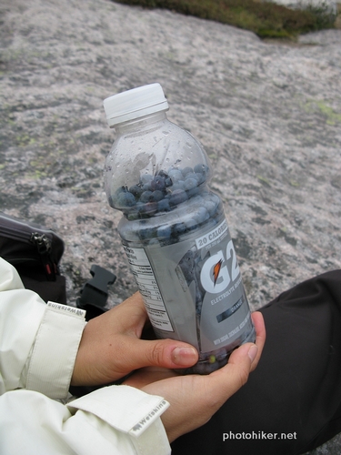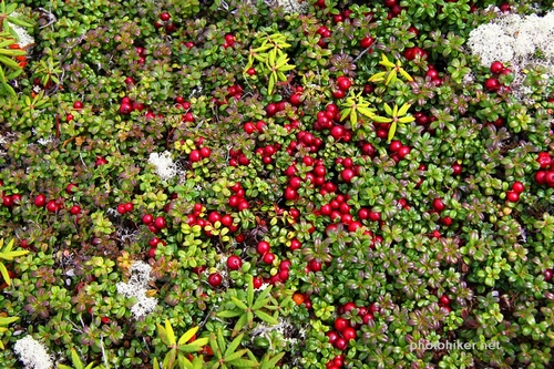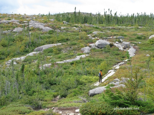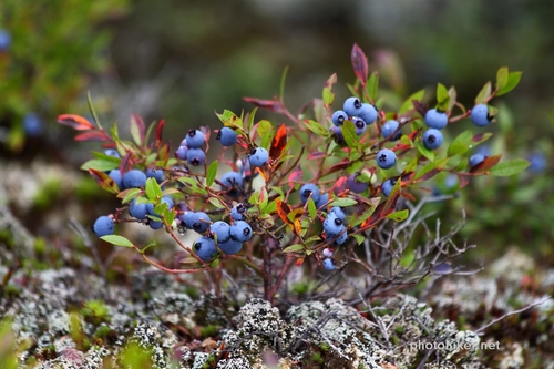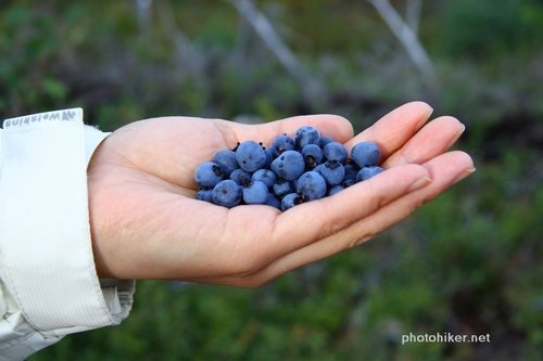Mont du Lac-des-Cygnes是园中最Popular的Trail。周三的时候我们走了Le Pioui + Mont du Lac-des-Cygnes Loop,全程11.4km。大部分游人都是直接爬山,而GuanGuan和我选择了从Le Pioui绕道上山。这条路很是清静,沿途的景色和植被也随着海拔升高变化多端。从碧绿的阔叶林到墨绿色的松林,再往上到低矮灌木丛,直到山顶的极地苔原,非常有特色。Trail一开始就是在林子里爬山,山路崎岖陡峭,很是累人。出了树林后小路逐渐平缓,路边蓝莓茂盛,又是一路不住嘴的吃。到后来都快吃不动了的时候,GuanGuan就将空的水瓶拿了出来,于是我们开始吃不了兜着走,等爬到山顶时居然摘了满满一瓶子蓝莓,现在想起来还是那么的过瘾呢。