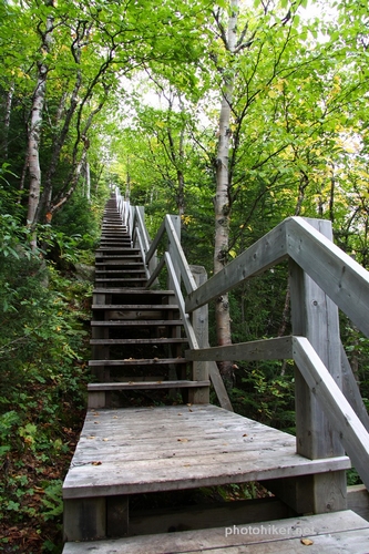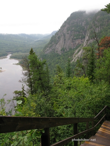 随后又去了Riviere-Eternite,此时雨势稍减,我们也顾不上雨后的道路湿滑,兴致盎然的踏上了Halte Bellevue Trail。一路上爬升不断,从石桥,木梯到木栈道无一不是又湿又滑。跌跌撞撞,说说笑笑之间回首翘望,Eternite Bay在一片雨雾朦胧中显得愈加幽静安宁,而远处的峡湾峭壁耸立,烟雨蒙蒙之中透着神秘幽远。Saguenay Fjord Park峡湾悠长,沿途两岸有着绵长的Hiking Trail,以及各种稀有的海洋动植物,是一个非常有特色的所在。但愿将来故地重游,我们可以在一个阳光明媚的日子好好欣赏这里的独特风光。