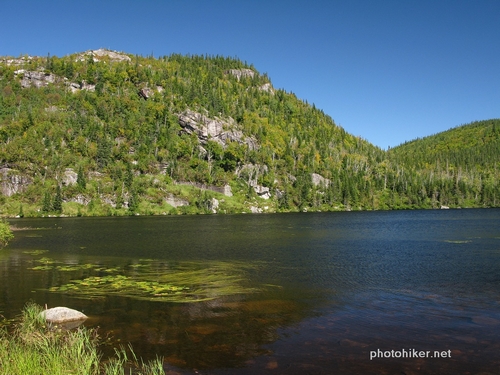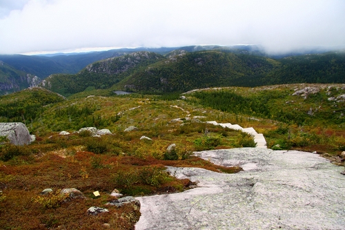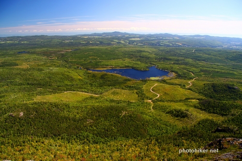 当天下山之后我们就赶往下一个公园,Hautes-Gorges-de-la-Rivière-Malbaie。到周五离开那里准备赶往最后一站Mauricie Park之前,趁着天气晴好,我们不想把大好时间都耗费在路上,于是又回到Grands-Jardins Park来了个故地重游。这次我们直接走Mont du Lac-des-Cygnes Trail上山,单程4km,爬升500米。登上山顶视野开阔,初秋的晴朗天空下,大山之中清幽的小湖,蜿蜒的小河,还有远方碧蓝色的St. Lawrence River都清晰可见。论景色一切要比前一次的乌云漫卷要强的多,唯一可惜的是这一路游人众多,路边的蓝莓已是寥寥无几了。