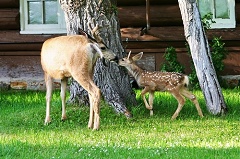 Site,几乎就紧挨着停车场,省了许多搬运之苦。搭帐篷时发现草地上布满大大小小的地洞,不一会儿就有东西在洞口探头探脑,原来是Ground Squirrel。这些小家伙们基本上不怕人,与宠物的区别也就在于它们不会主动接近你。更有甚者是Waterton小镇中的白尾鹿。它们三五成群的在车来车往的街道两边闲逛,该吃的吃,该睡的睡,偶尔还你追我赶的打打架,完全就是旁若无人。