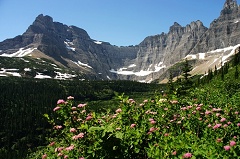 Peaks已经突兀在眼前了。Continental Divide在这一段被称为"Ptarmigan Wall",显然是以它城墙般的俏丽高耸著称的,与那笔直高耸的千尺绝壁相比一切都是那样的渺小。山路一直在缓缓的上坡,但是眼前的风景实在让人顾不上去想身体的疲惫。离山脚下越来越近了,跨过两条小溪再爬上一座小山坡,眼前油油的草地上开满了大片大片的Glacier
