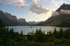National Park,夕阳照耀下的远山依旧云雾缭绕,映得雨后的树林更加青翠欲滴。到St. Mary Lake时一道巨大的彩虹横跨在整个湖面上,为雨后依旧阴郁的天空平添一抹亮丽。再往前便是Glacier