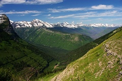 National Park,由东向西沿Going-to-the-Sun Rd.向Logan Pass进发。再次见到Wild Goose Island,没有彩云相护的画面与昨晚相比要逊色很多。随着山路的不断爬升,身边的峡谷变得越来越幽深壮观,道路也越来越艰险。一边是望不到顶的高山,一边是深不可测的山谷。就这样一路走走停停,到达Logan