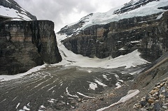 Glacier分立两侧。在这冰雪连山的景象中最惊险壮观的是那被称为The Death Trap,位于Abbot Pass和Lower Victoria Glacier之间的一道冰河瀑布。那从两山夹缝中倾泻而下的冰瀑看上去仿佛还在流动,偶尔有冰雪崩裂的隆隆巨响,伴随着冰层下面的阵阵水声,那场景颇有些惊心动魄。