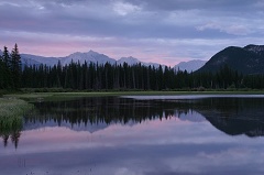 1再往南走不远就是Banff小镇了。暮色中来到公路边的Vermilion Lake,平静的湖水倒映着Mt. Rundle的雄伟身姿,如果再加上漫天彤云,那将是又一幅经典的Banff山水画。如今天边只有一道淡淡的红晕,象宣纸上洇开的朱砂,那一份恬淡随意同样充满了诗情画意。