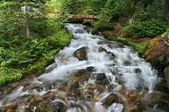 Valley的起点,9点钟准时上路。Paradise Valley在各种Hiking指南中都被评为最佳之一,近20公里的行程中几乎囊括了落基山脉所有的经典景观,从森林到草原,从瀑布到溪流,当然还有那看不尽的雪山,翠湖和冰川。然而这条线路走的人却很 少,据书上说是因为最初的5km冗长而缺少风景的山路令人望而却步。沿着密林中高低起伏的山路一直向前,不时会有潺潺溪水从路边的山林中逐级跌落,汇入旁边欢唱着的Paradise