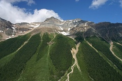 Temple北坡脚下的碎石陡坡,冰雪覆盖的Mt. Temple在身旁巍然矗立,右边绿油油的山谷中隐约可见Paradise Creek奔流不息。山谷另一侧与Mt.