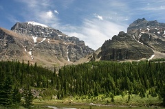 Meadow已经遥遥在望了。在这群山环抱的山谷深处,那座座需仰视才可见顶的巍峨雪峰象一个个顶天立地的巨人,从左边的Mt. Temple,Pinnacle Mt.,到前方的Eiffel