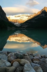 Louise的日出了,无论如何不能再错过了。晨曦微明中已经有三三两两的游人徜徉在湖边,Mt. Victoria在初升的朝阳中由朦胧静谧变得清晰亮丽。那暖暖的阳光好像一支饱蘸金粉的画笔,随意的涂抹在山巅云端,将一幅凝重的泼墨山水变成了精致的彩绘。与艳阳下的明艳照人相比,此时的Lake