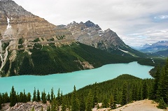 Lake,蓝绿色的湖面水波荡漾,没有蓝天没有山影相伴的Bow Lake少了一份摄人心魂的美,不免有些遗憾。随后开车一路爬坡来到位于Bow Summit的Peyto