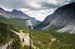 Summit便是一路下坡,其间远眺过Snowbird Glacier 后便来到Waterfowl Lake。这里又是一个摄影师们早晚经常出没的地方,如今在正午的阴云天下实在是不够出色。随后峰回路转,很快就到了Mistaya