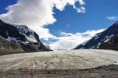 Icefield。乘雪车上冰川价格不匪,在上面的时间又有限,因此我们决定走到冰川脚下去亲身体验一回。直接来到冰川下的停车场,换上厚夹克,我们全副武装的向冰川前进。从停车场到冰川边缘的近一公里的山路陡峭而崎岖,再加上顶着狂风呼啸,走起来真的很吃力。四周是寸草不生的沙石地,不过100年前这里还依然是为冰雪覆盖,如今冰河退却留下了这空旷的山谷和荒芜的土地。爬上一个小山坡,巨大的Athabasca
