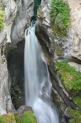River在这里从高处的Maligne Valley坠入Athabasca Valley,急流的侵蚀冲击造就了这近50米深的幽幽峡谷。沿着峡谷边缘的小路一直在下坡,碧绿的河水在幽深的谷底翻腾奔流,时隐时现。峡谷两侧的岩壁上刻满被激流雕琢过的深沟浅壑,丛丛翠绿的苔藓和矮松点缀在那纹理细腻的石壁上,险峻却又不失清秀。沿途有四座小桥跨过那数米宽的峡谷,几乎每座桥边都有一道小瀑布。优雅的身姿,碧玉般清润的色彩,如低垂的轻纱抚过清幽冷峻的山岩。原路返回时变成了艰苦的上坡,好在是阴天,还不算太吃力。 从Maligne