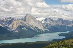 Canyon出来天空已经有些放晴的意思,远处的山谷虽然依旧云雾缭绕,但云隙中透出的天空蓝的那么动人。中途在Medicine Lake稍做停留后我们直接来到了Maligne