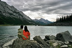 Lake是Maligne Lake Rd.中的一大景点,绵延数公里的湖面碧波荡漾,陡峭冷峻的Queen Elizabeth Range在她身旁拔地而起。尤其是水下那尚未探明的庞大的地下暗河系统为这本来已是蔚为壮观的湖光山色又增添了一份神秘。来到湖边的时候天气依然阴沉,但远处有一片蓝天,金色的夕阳渲染着天边的层云,GuanGuan和我坐在湖边的巨石上,看那夕阳中的远山和变幻的行云。不知不觉中山风带来了丝丝细雨,不经意间回头一看,只见乌云卷着雨雾已经沿着山谷缓缓的压了下来,山脚下的公路居然已经看不见了,那昏天黑地的感觉不禁令人毛骨悚然。我们俩从石头上一跃而起,抓起相机,背包和三脚架向车中飞奔而去。刚钻进车里外面就已经暴雨如注了。车窗外什么都看不见了,只有白花花一片水墙。大概10分钟后雨势稍减,透过窗外迷蒙的雨雾,惊喜的发现远处的山峰在天边的晴空衬 托下已经变成一幅沧桑凝聚的剪影。在这看不尽的山水中,黑白世界也同样的精彩。