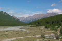 Falls继续南下,山路一直沿着Sunwapta River蜿蜒在群山之中。路的左边是集奇异与壮观于一身的Endless Chain Ridge。那绵延十几英里的倾斜陡峭的山坡象一幅斜倚的画板,冰川的雕凿,风霜的侵蚀在坚实的山体上留下道道纵贯上下的深壑,使得那象刀刃般锋利的山脊愈发参差有致,无论是远观近看都是那样与众不同。随后经过Mushroom和Diadeam