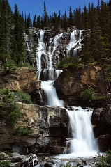Fryatt和Mt. Christie在碧水环绕,松林拥护下显得愈发清秀挺拔。再往前便来到Sunwapta Falls。这里的景致于Athabasca Falls相似,激流奔涌,声势浩大,在丽日晴空下远山近水更是气象万千。