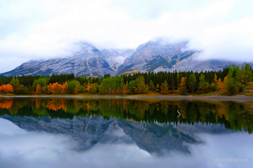 带好全套的装备大家一起沿着Trail走进树林,一路下坡,很快就隐约见到了湖水。等我们从林子里钻出来站在湖边,那映入眼帘的图画竟然令我神思恍惚。方才分明还是凄风冷雨,如今竟幻化成平湖如镜,山影相映的清丽景色。虽然是阴沉欲雨的天气,但挟着细雨的云雾却非暗沉的灰,而是轻盈的白。云雾缥缈,虽隐匿了山的伟岸,却平添了一份柔美,就这样静静的倒映在一泓碧水之中。一簇簇明艳的金黄点缀在山脚下浓绿的松林中,使得这样一个天色阴郁的早晨添了几分妩媚姿色。所谓淡泊宁静, 便是眼前这清晨时分的Wedge Pond。