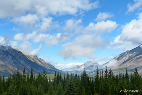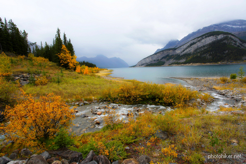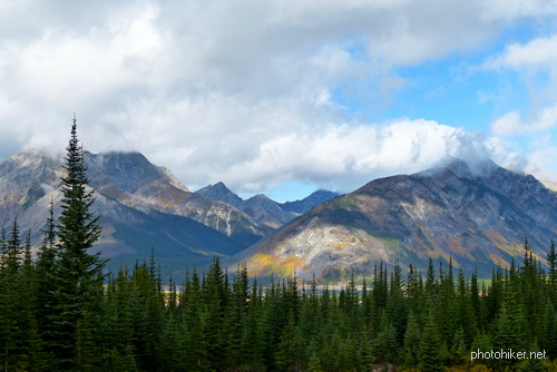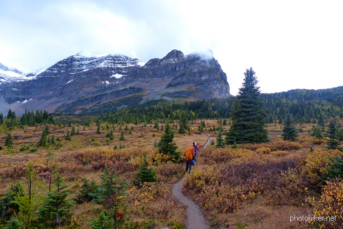 从Lodge到营地的一段路风景真美啊!近在咫尺的高山加上浓郁的秋色,看得人流连忘返,不时的停下来拍照。