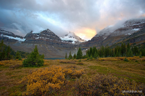 眼前的Mount Assiniboine却依然隐身于云雾之中,任凭身旁风起云涌,始终不肯露出她那金字塔般主峰的全貌。在红日西沉的某个瞬间,萦绕在主峰上的阴云被夕阳映照,蓦然显出些许晚霞的红晕,恍若少男少女一见倾心时面颊羞涩的绯红,恬淡动人,却又转瞬即逝。