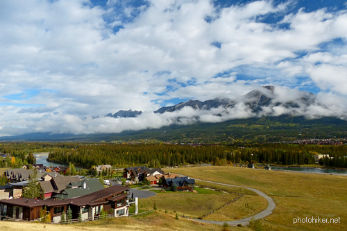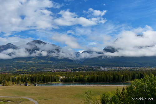 晨拍结束后赶回Resort。Charles和Michael已经出发去位于Sunshine Village的Trail Head,准备跑步进山了。QQ和70也没有去拍照,此时已经给大家准备好了早餐,还有中午吃的三明治,真是好同志啊!早上阴雨连绵,到我们出发的时候竟然雨过天晴,蓝天重新。白云在山间悠悠飘荡,想象着即将出现在眼前的Mount Assiniboine也是如此白云飘渺的沐浴着艳阳,那样的情景简直令人飘飘欲仙了。