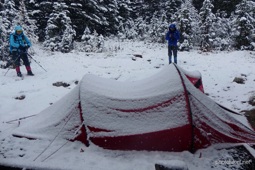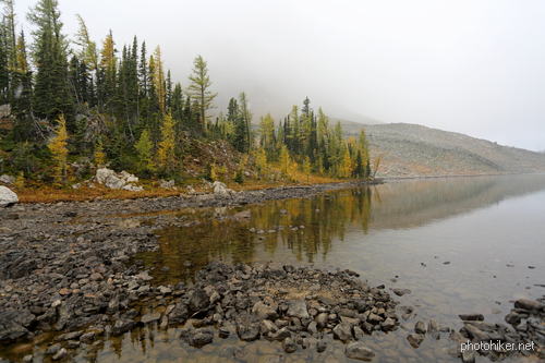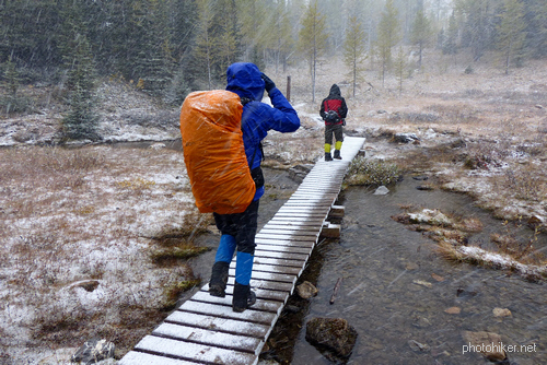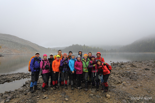 惊心动魄的香蕉皮事件之后,大家收拾行装准备去Hiking。今天的天气不是一般的差,远山近水都消失在一片雨雾迷蒙之中。天气预报今天有>15mm的雨,到这山里大概就是至少15cm的雪了。因此我们放弃了爬山,实在是爬到山顶也什么都看不见,就去附近的几个小湖随便走走吧。一行人全副武装,雨衣雨裤,Gaiter手杖,大大小小的背包都罩着防雨罩。出营地走不多远便是Sunburst Lake,此时绵绵细雨已经变成了细碎的雪花,低沉的阴云几乎压到了湖面上,身旁高耸的Sunburst Peak连一点影都看不见。
