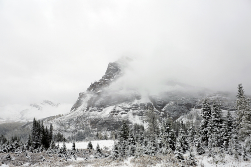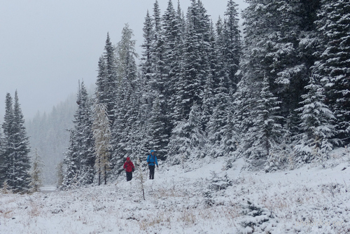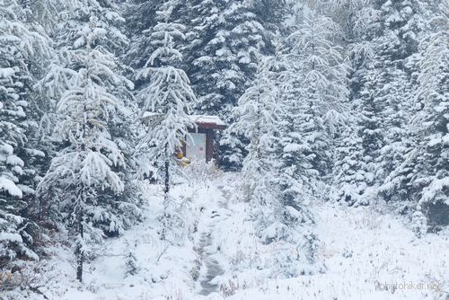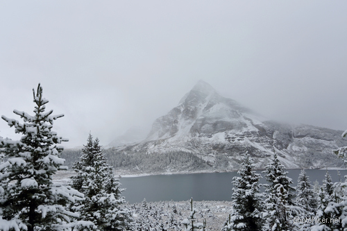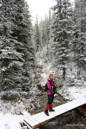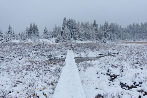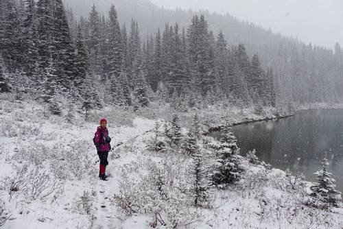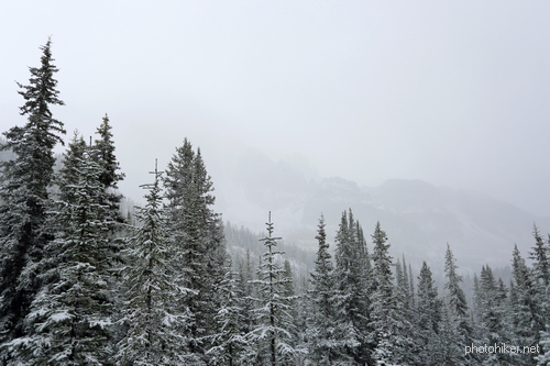 过了通往The Nublet的岔路口,再往前就来到小小的Elizabeth Lake。透过漫天雨雪,高山湖泊特有的一抹碧绿依旧隐约可见,若是晴天,这里定然是一幅雪山翠湖相映如画的美景。雪越下越大了,细碎的小雪粒也逐渐变成密集的雪花,随风飞舞着。地面上的积雪越来越厚,身旁的松树也变成了玉树琼枝,转眼之间天地已是银装素裹,我们已经完全置身也一派北国的林海雪原之中。风雪隐匿了四周的高山,眼前的山林雪景竟与Algonquin有着惊人的相似。明明是千里迢迢的来赏秋景,结果提前把冬日景色看了个够。