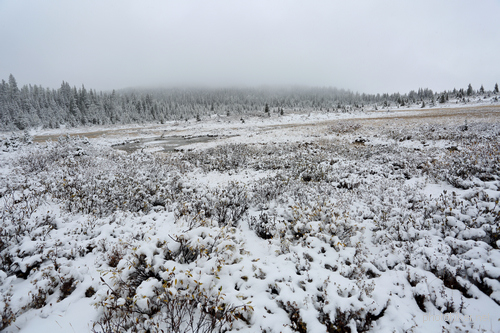 哆哩哆嗦的在这四面透风的餐厅喝完早下午茶,看天色还早,与其在这里受冻,大家决定不如长途跋涉,到Lodge去享受一下真正的下午茶。从营地到Lodge有2.5km,我们今天走了一条靠近湖边的小路。一路上依旧是风雪漫天,云山雾罩,昨日还是铺满酽酽秋色的原野如今已是洁白一片。